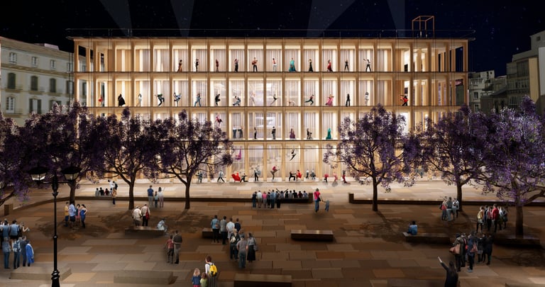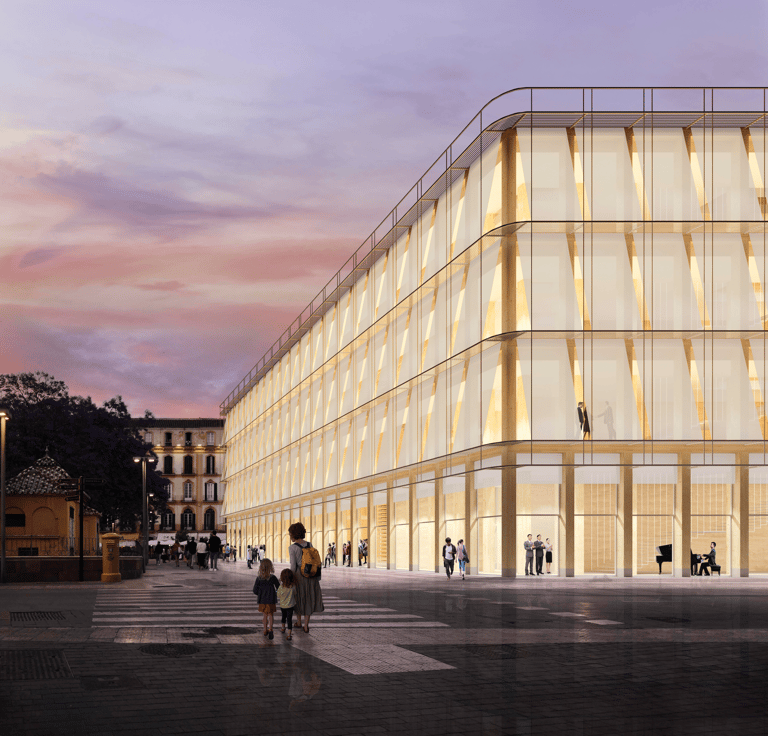 This wooden cultural center in Málaga, where strong sunlight is a key factor, features a versatile design for various activities. Its standout smart textile façade adapts to light, temperature, and privacy needs, providing essential protection and enhancing functionality, creating a dynamic and sustainable space.
