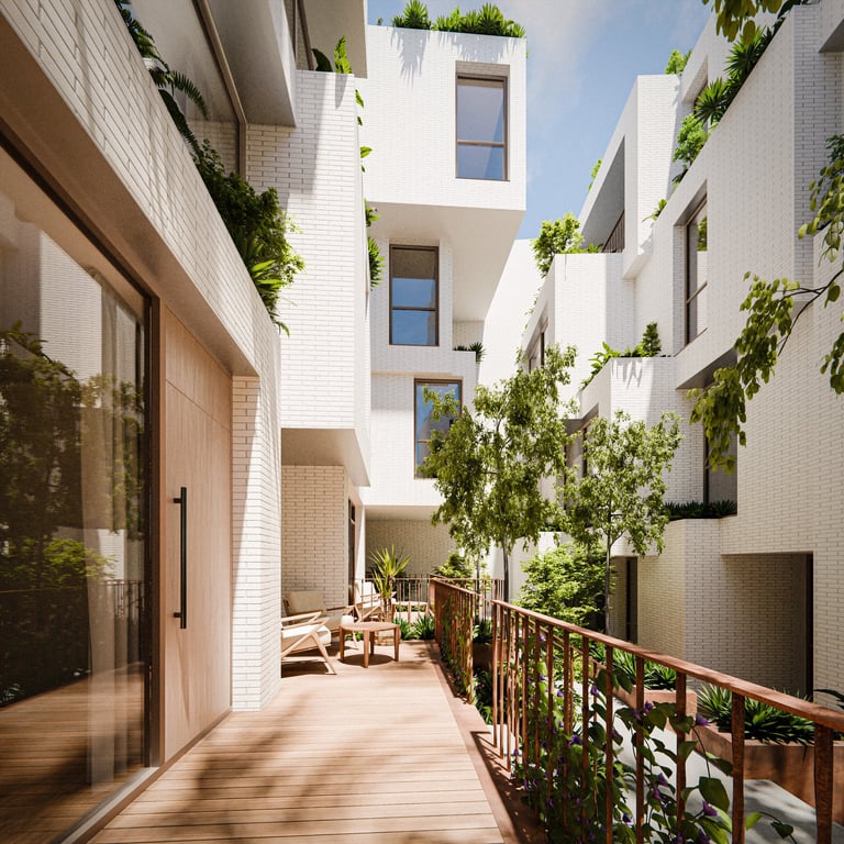 At HC56, an oasis of light and greenery emerges within a dense urban fabric, with 56 homes organized around a series of communal courtyards. Through a generative, data-driven workflow, each courtyard was parametrically designed to optimize the amount, distribution, and density of vegetation, balancing planters, greenery, and light penetration to enhance daily living. The resulting proportions create a harmonious relationship between built space and nature, ensuring bright, comfortable, and biophilic communal areas.